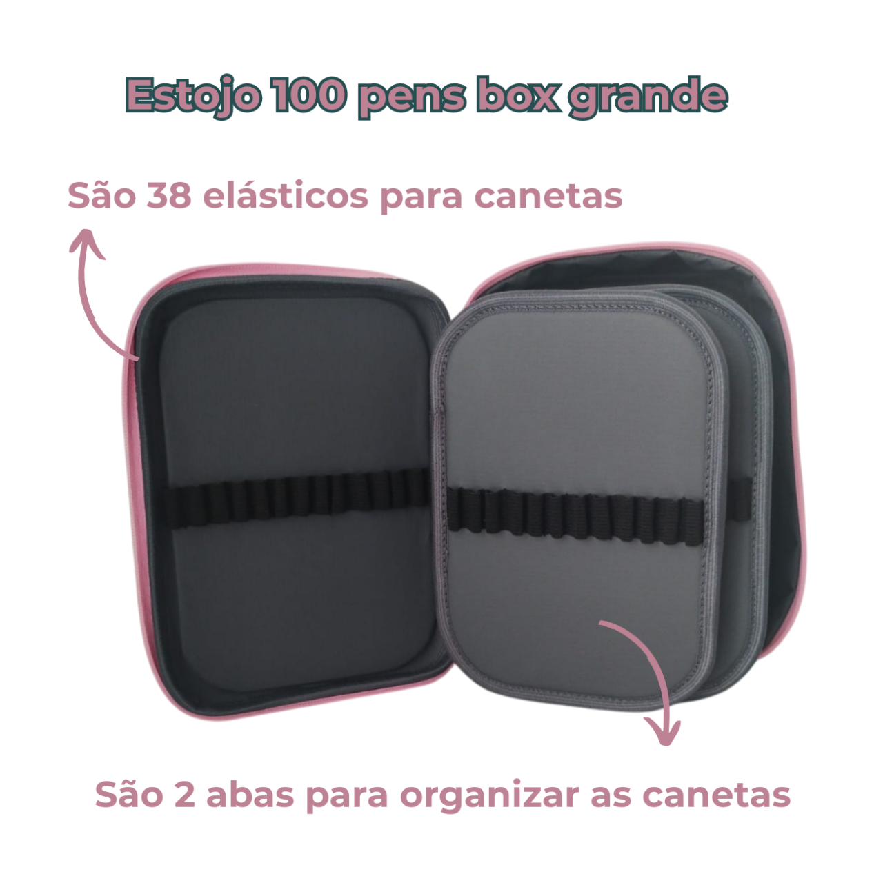 São 38 elásticos que facilitam a organização das suas canetas, são dois bolsos para suas canetas grossas, sua alça de mão facilita o transporte. Imagine nunca mais precisar vasculhar gavetas ou bolsas em busca da caneta certa!