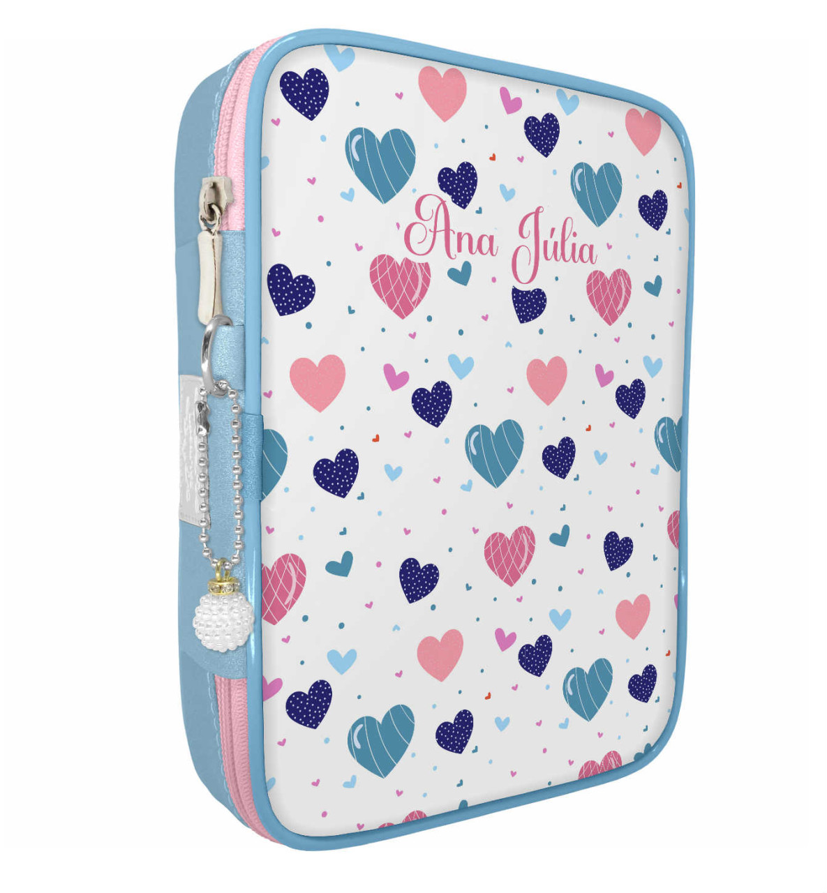 Estojo 100 pens box slim escolar coracoes azul