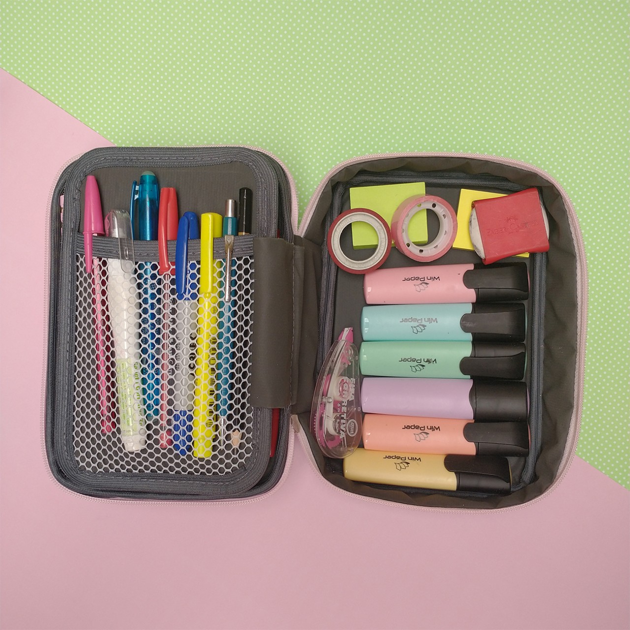 São 26 elásticos que facilitam a organização das suas canetas, bolso para suas canetas grossas e o box para outros itens. Imagine nunca mais precisar vasculhar gavetas ou bolsas em busca da caneta certa!
