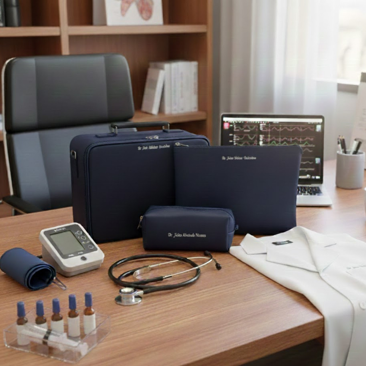 Estetoscópio, termômetro, esfigmomanômetro, luvas, agulhas, seringas, medicamentos, canetas, carimbo e outros materiais essenciais.