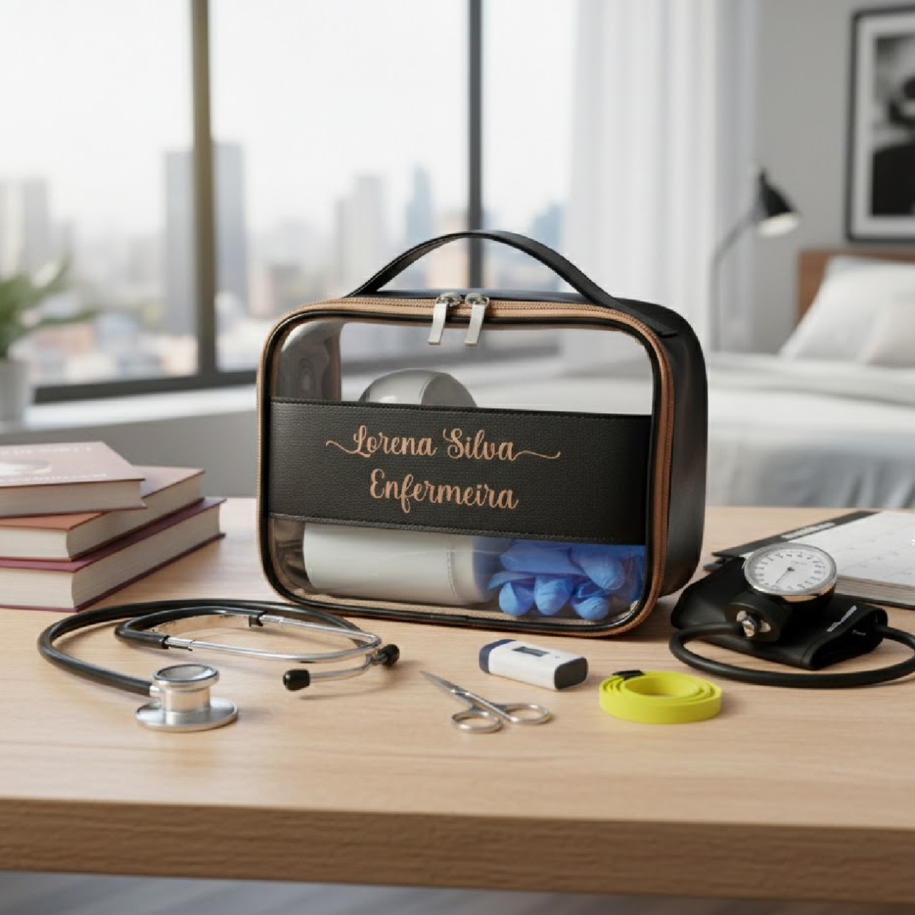 Estetoscópio, Esfigmo, Oxímetro, Luvas, Canetas, termômetroe outros itens.